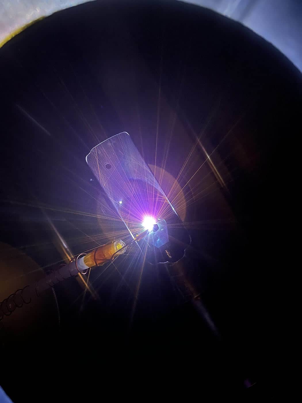 A shower of charged carbon ions emitted in a plume from the ablation of a graphitic carbon target using a high-power ultraviolet laser. This photo was taken in the Ultracold Neutron Guide-Coating Facility at the University of Winnipeg, where Diamond-Like Carbon thin films are manufactured for the TUCAN collaboration.