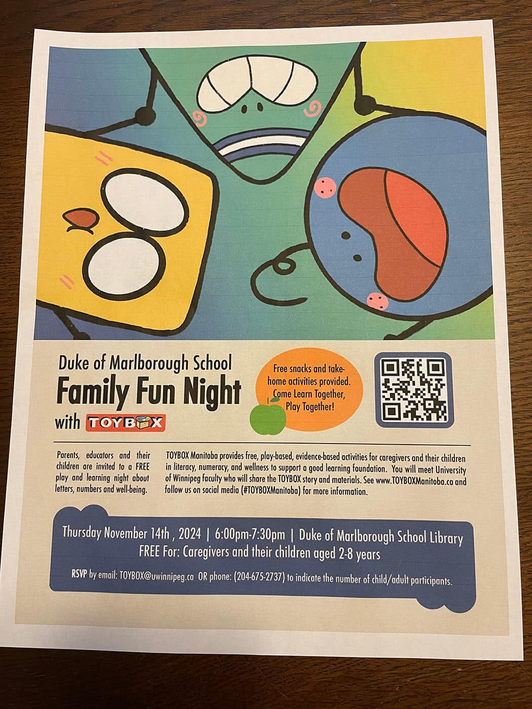 The photo depicts a TOYBOX poster used as advertisement for the Churchill Family Fun event. The poster features artwork from a student graphics team, who create all of the fun, playful images for the TOYBOX project.